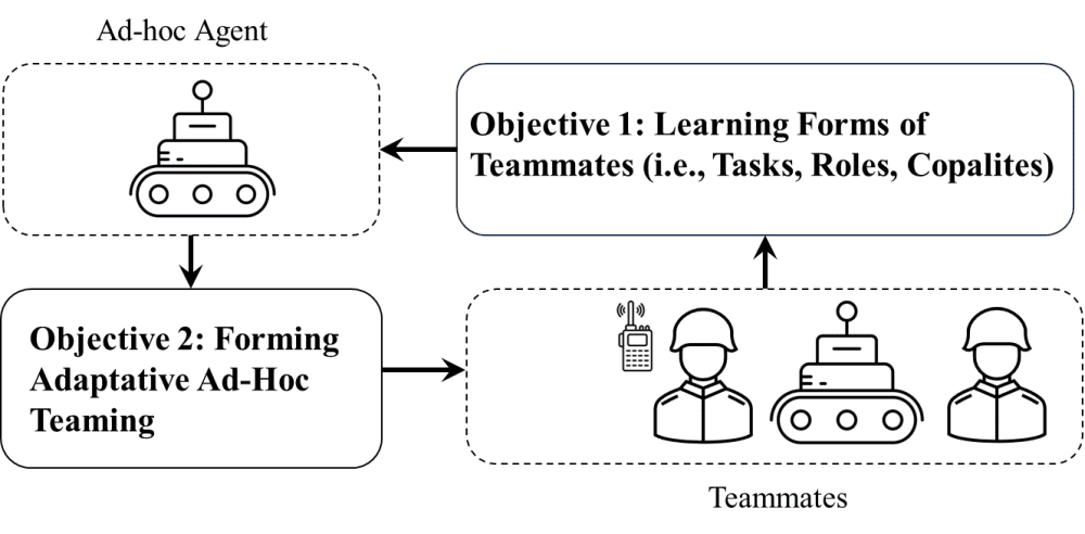 • Modeling Teammates and Missions. The first objective aims to develop a sequential learning framework that enables the ad-hoc agent to model its robots and human teammates’ mission, strategies, and capabilities using Bayesian inference and inverse reinforcement learning.