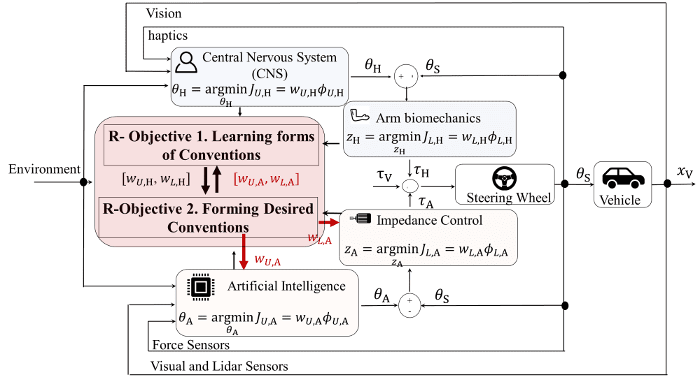 Humans may gravitate to different strategies for resolving a conflict. A hypothesis behind the seamless human-human collaboration is that humans can adaptively form conventions. A convention is defined as a low-dimensional shared representation that captures the interaction. However, forming conventions in human-robot teams is difficult because the human partner is a non-stationary agent. This project aims to design and test adaptable and convention-based control transfer strategies to enhance joint driving performance and subjective assessment of driving in the presence of a conflict between the driver and the automation system. To this end, two research objectives are defined for this project.